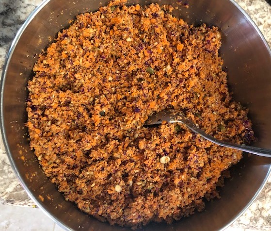 - Add to carrot/nut mixture and mix until seasoning is evenly distributed