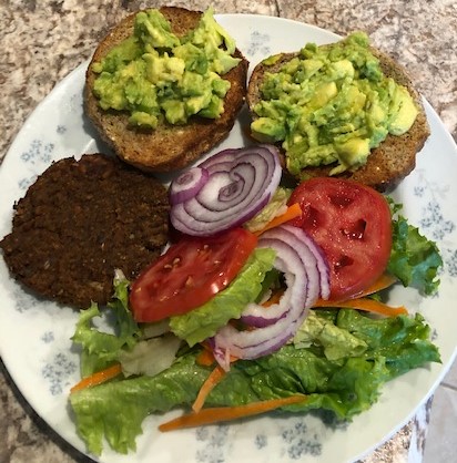 This burger is really delicious and nutritious as well. It smells like fried chicken when it is done. I serve mine on Ezekiel bread rolls with avocado, lettuce, onions and tomatoes. It is usually an easy lunch for me.
