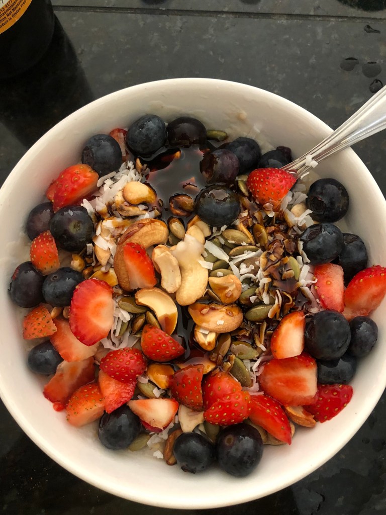 - Organic steel cut oats cooked in nut milk and Himalayan salt to taste