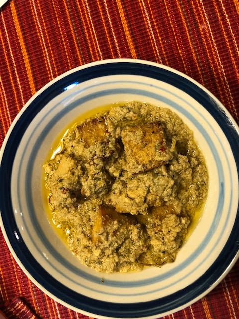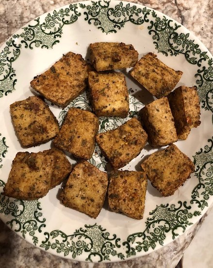 I serve my Eschoviech tofu with brown rice and peas, but you can serve it however you wish. It is excellent as finger food or hors d’oeuvres. For that fish taste, you can use black salt and dulse flakes in your seasoning.