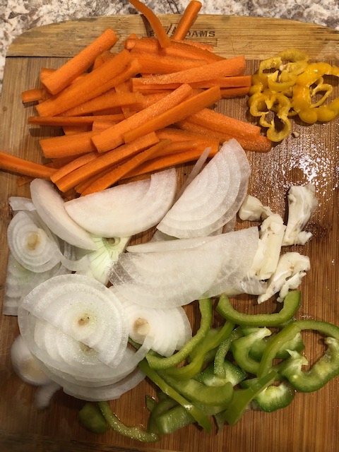 - Slice onion, sweet pepper, carrot, and scotch bonnet pepper as seen on the cutting board below.