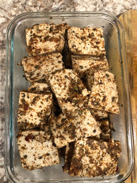 - Cut and season tofu to taste. Usually, I will cut into squares, then add my favorite seasonings( basil, garlic onion powder, Italian seasoning, sriracha) add 2 tablespoons Braggs Liquid Aminos and toss tofu until the pieces are covered and the Braggs soaks through. I store it in the refrigerator and use an amount whenever I need it. This gives it time to absorb the seasoning and add to the flavor when cooked.