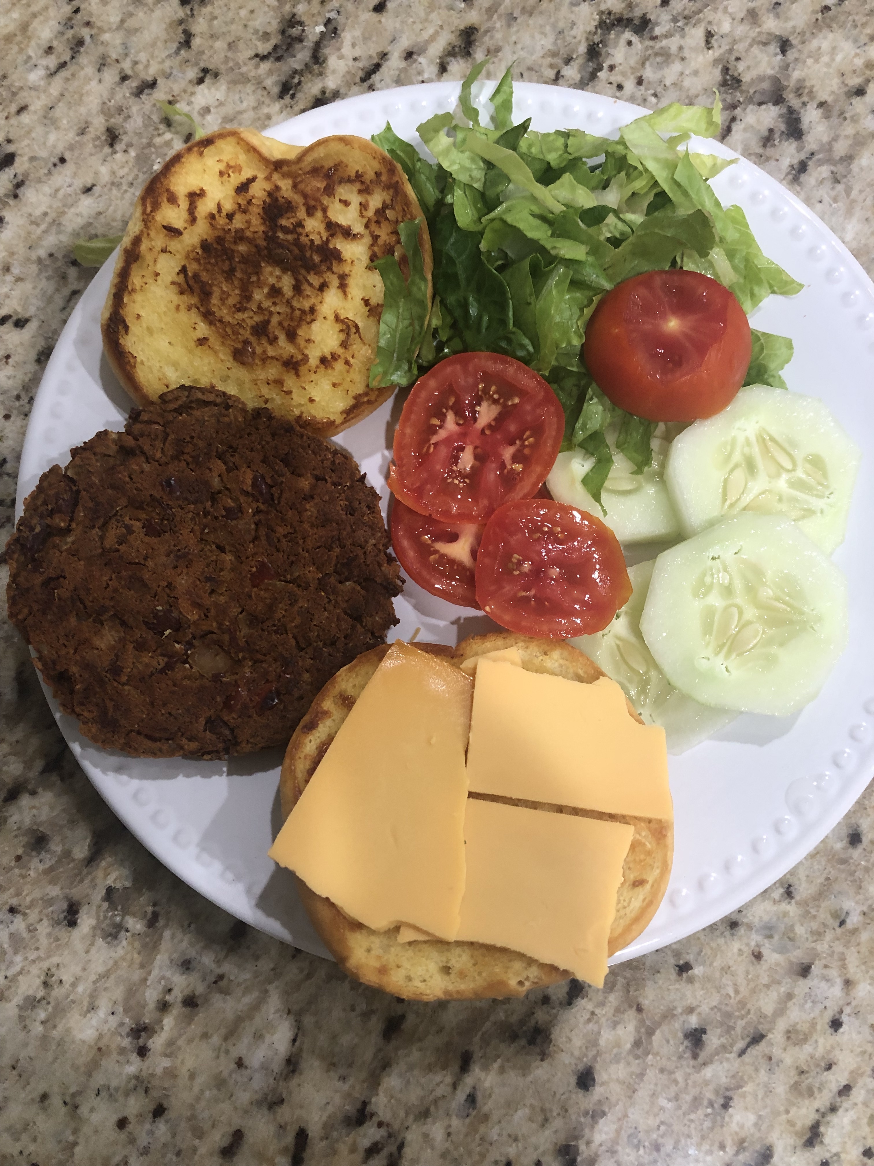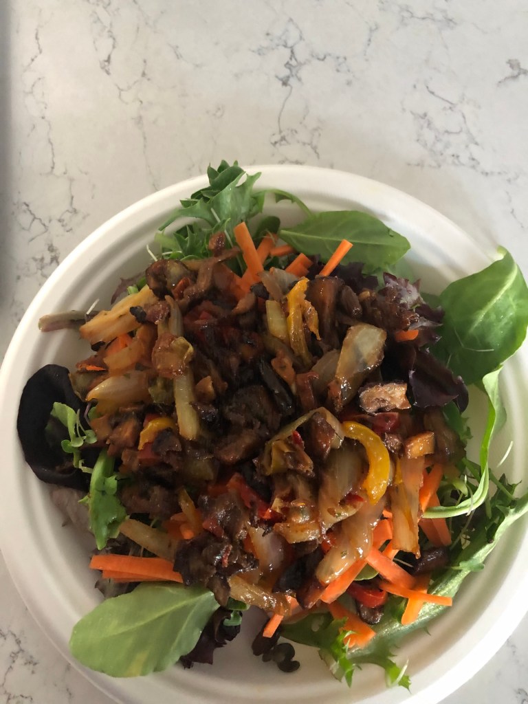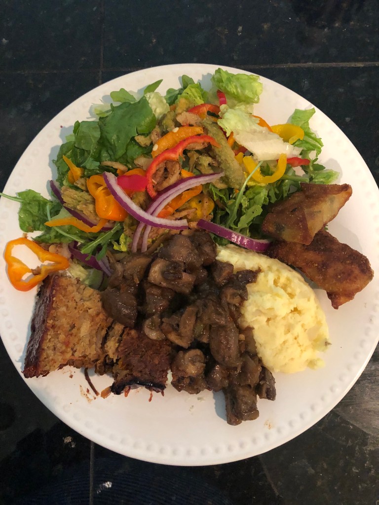 Meatloaf, sauteed mushroom, mashed potatoes, vegetable salad, and vegan egg rolls