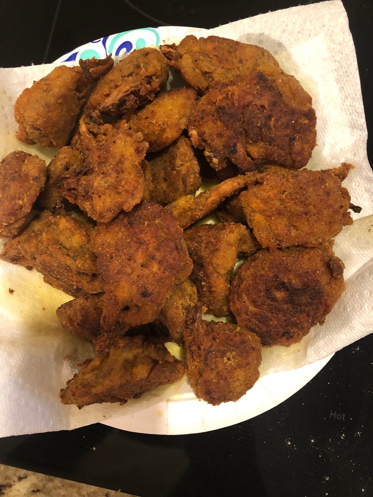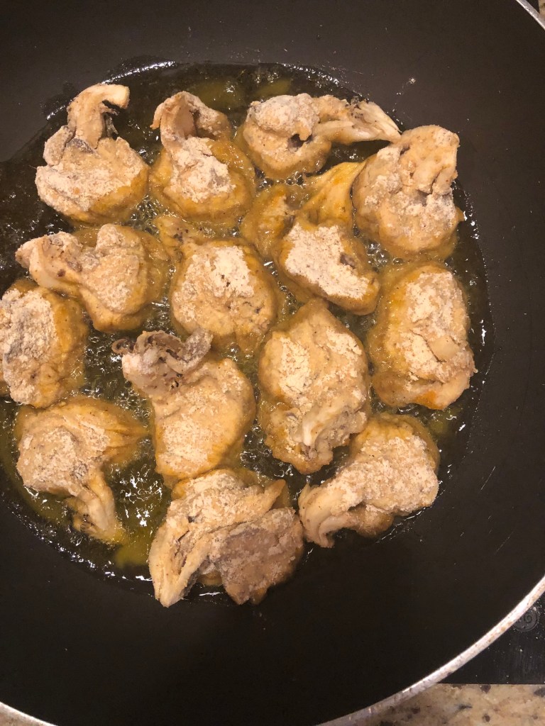 - In a large skillet, heat enough oil to deep fry the pieces until crispy